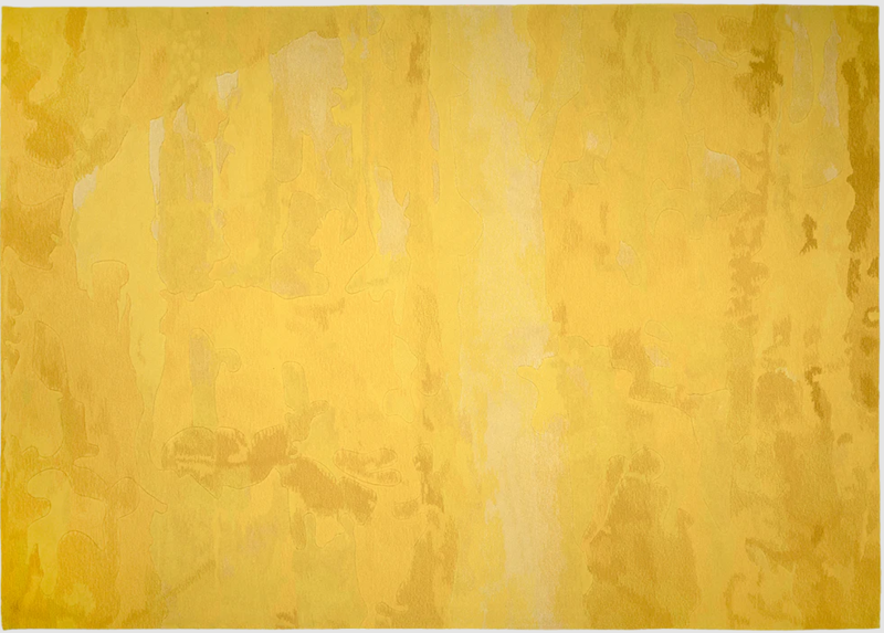 Aurora évoque un paysage vu du ciel, comme une étendue lumineuse saisie dans la transparence d’une aquarelle. Le dessin se construit à partir d’un subtil travail de dégradés, où les variations de jaune et de doré se superposent et dialoguent avec la lumière.