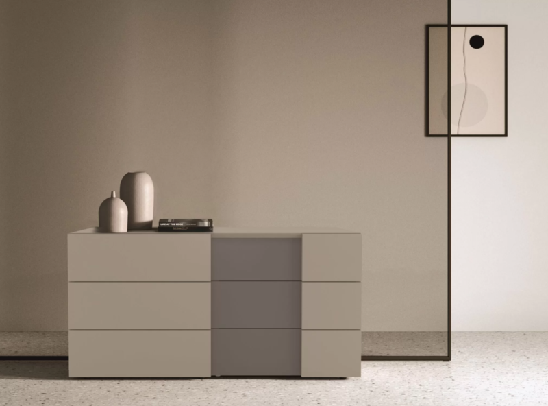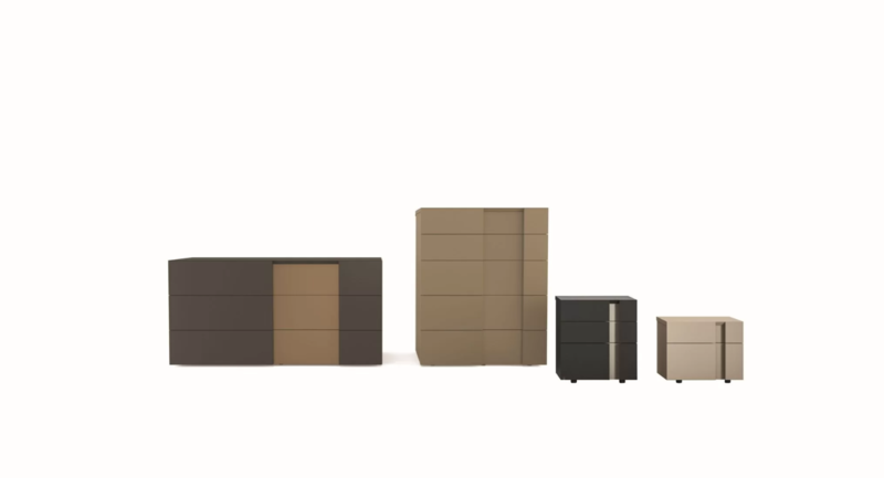 Chevets et commodes avec structure en particules de bois en laqué mat. Les façades des tiroirs en MDF, quant à elles, sont caractérisés par une bande verticale particulière qui peut être personnalisée dans la finition laqué mat, metal standard ou bois. L'ouverture se fait par une prise encastrée sur la façade.