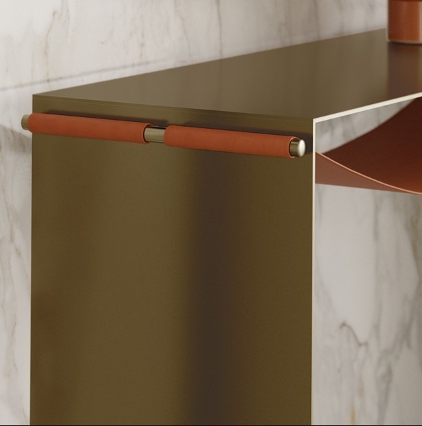 La structure est en métal laqué et est proposée en différentes finitions, tandis que le plateau est disponible en plusieurs finitions en cuir.