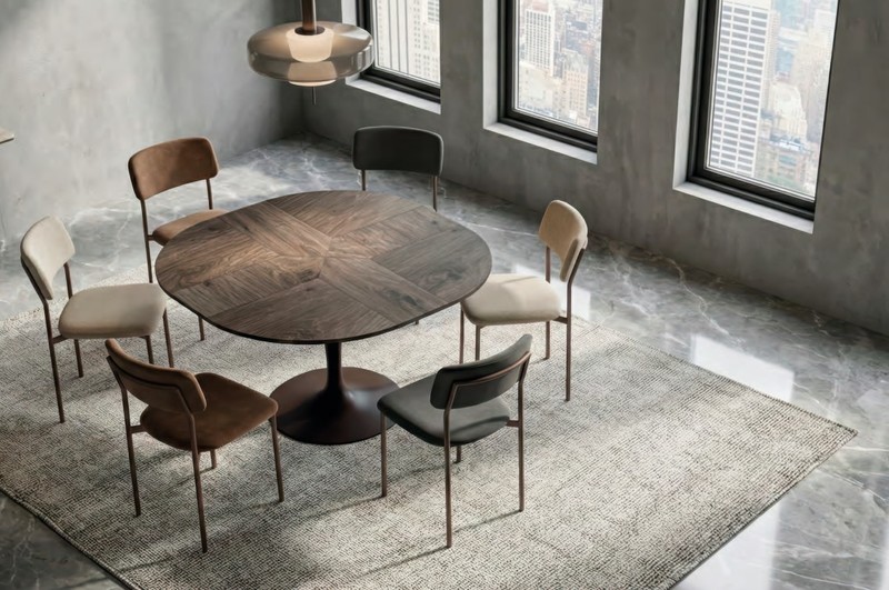Une table ronde moderne, ingénieusement extensible grâce à un mécanisme en aluminium de dernière génération. Son plateau fluide s'étend en longueur et en largeur, offrant un espace modulable. Le piètement central, aux lignes douces et fuselées, allège la structure et garantit un confort optimal.