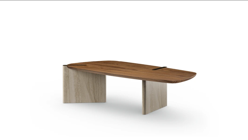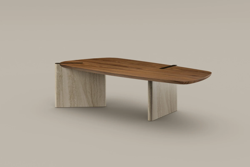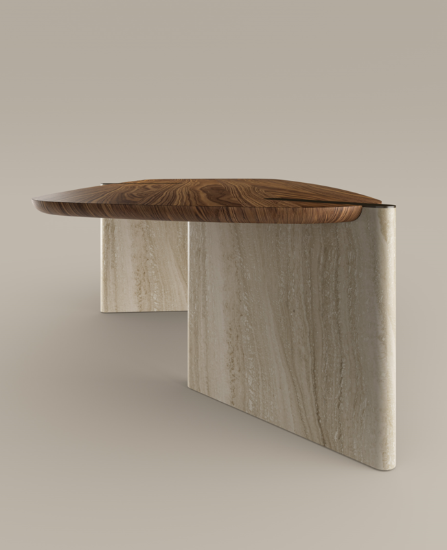 - Une autre option est fournie par la Free Combination (Combinaison Libre) qui permet une libre association des matériaux du plateau en bois et de la base en bois laqué dans les tonalités plomb et bronze.