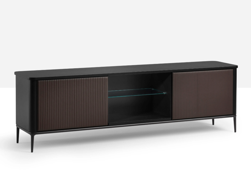 La version de 55 cm de hauteur dispose d'une étagère ouverte avec étagère en verre. Soutenu par les pieds coniques qui définisse la ligne de la collection, le buffet Lea se caractérise par l'extrême légèreté des formes et le design doux. Les revêtements des portes embrassent le choix de tissus élégants ou de matériaux traditionnels, ce qui le rend polyvalent et original pour intégrer des environnements contemporains.