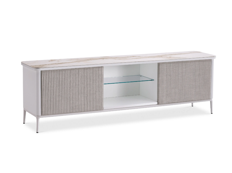 Buffet Lea. Élément de rangement pour le salon avec portes battantes en mdf laqué ou recouvert de tissu, simili cuir ou cuir. Plateau en MDF laqué ou céramique.