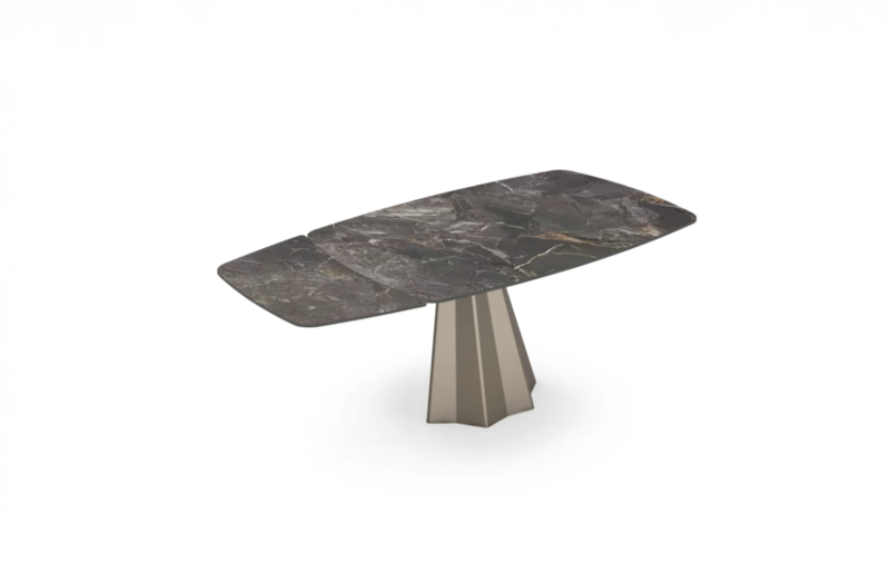 Le plateau en tôle pliée de façon asymétrique confère avec élégance à la table un caractère dynamique et contemporain, créant un équilibre parfait entre stabilité et simplicité. Ce plateau, disponible en différentes finitions, s'ouvre grâce à un ingénieux mécanisme pivotant qui permet d'agrandir la surface d'un simple geste et d'accueillir ainsi davantage de convives.