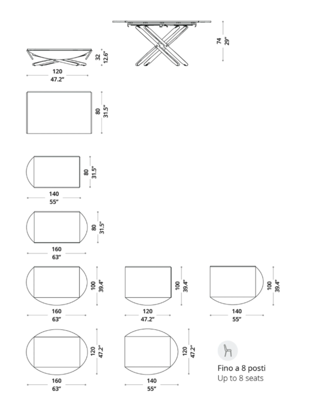 Dimensions de la table basse entièrement ouverte : 120×160 cm H74